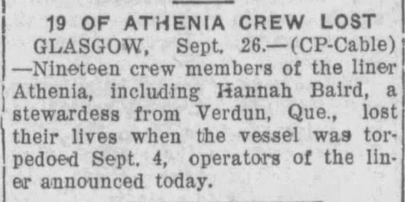Le 4 septembre 1939, à 19 h 39, l’Athenia est torpillé par l’U-30 à 250 milles (402 km) à l’ouest d’Inishtrahull, Irlande. Le sous-marin a fait surface et a canonné le paquebot à deux reprises qui transporte 1 103 civils et 315 membres d’équipage. Le canot de sauvetage, avec à son bord Hannah Baird, heurte l’hélice du MS Knute Nelson venu au secours des naufragés. Cette collision tue 52 femmes, dont Hannah Baird, et trois marins. L’attaque a coûté la vie à 112 personnes.