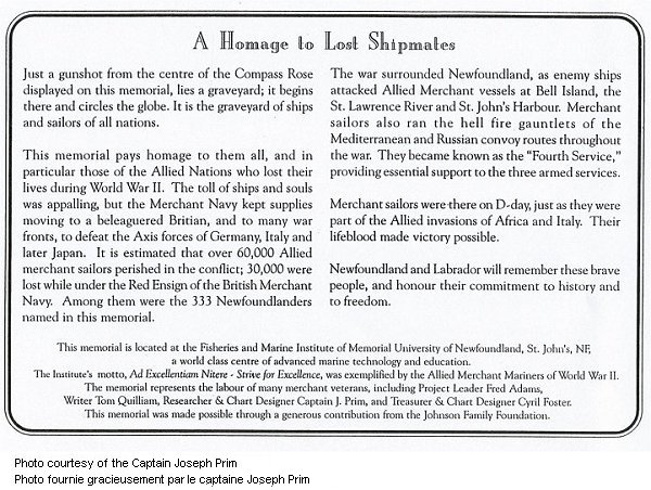 Ce Monument commémoratif, érigé au parc de Point Pleasant dans la capitale de la Nouvelle-Écosse, est l'un des rares hommages concrets aux hommes disparus en mer. Pendant la Seconde Guerre mondiale, la Marine royale du Canada perdit vingt-quatre navires et près de deux mille membres de ses effectifs.