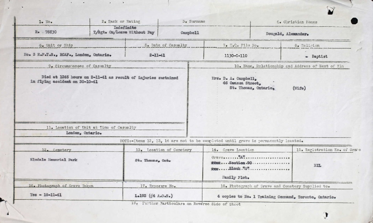 Le sergent Campbell travaillait comme instructeur pour la formation du personnel civil dans le cadre du Programme d'entraînement aérien du Commonwealth britannique à la 3rd Elementary Flying Training School à London (Ontario). Il est mort le 2 novembre 1941, de blessures subies lors d’un accident de vol survenu le 30 octobre 1940.