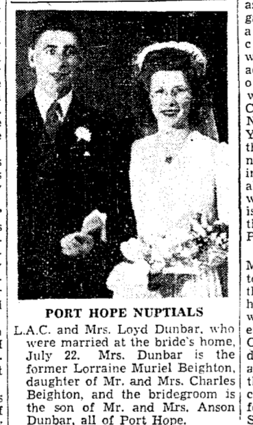 Fils de Anson et Mabel Dunbar, de Port Hope. Époux de Lorraine Dunbar, de Port Hope.