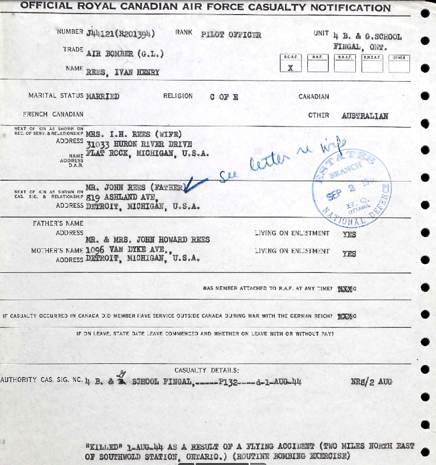 Fils de John Edward et Aletha Maud Rees de Detroit, Michigan, É.-U. Époux de Jean E. Rees de Flat Rock, Michigan.