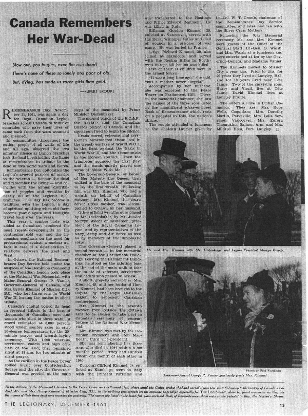 Fils de Harry Ellsworth et Sylvia Janet Kimmel (La Mère de la Croix du Souvenir (Croix d’argent) de 1961), de Milner, Colombie-Britannique.