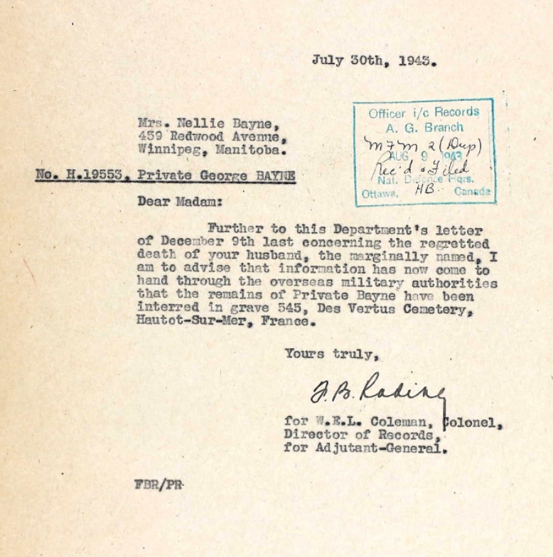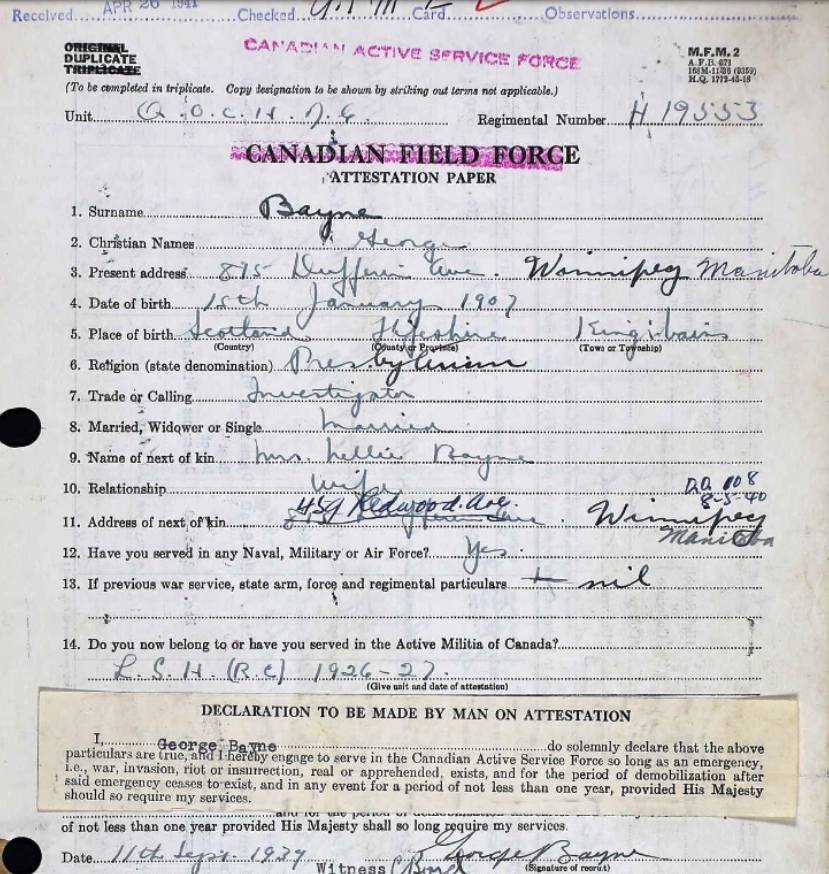 Fils de George P. et Katherine Bayne. Époux de Natalie Bayne, de Winnipeg, Manitoba.