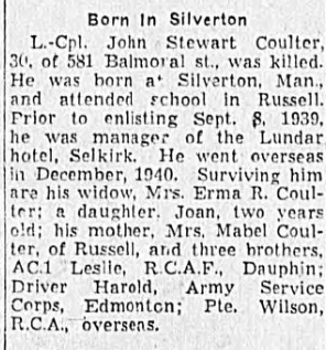 Frère du sergent Robert Leslie Coulter, décédé le 25 mars 1944 pendant qu’il servait dans le Royal Canadian Air Force.
