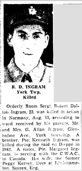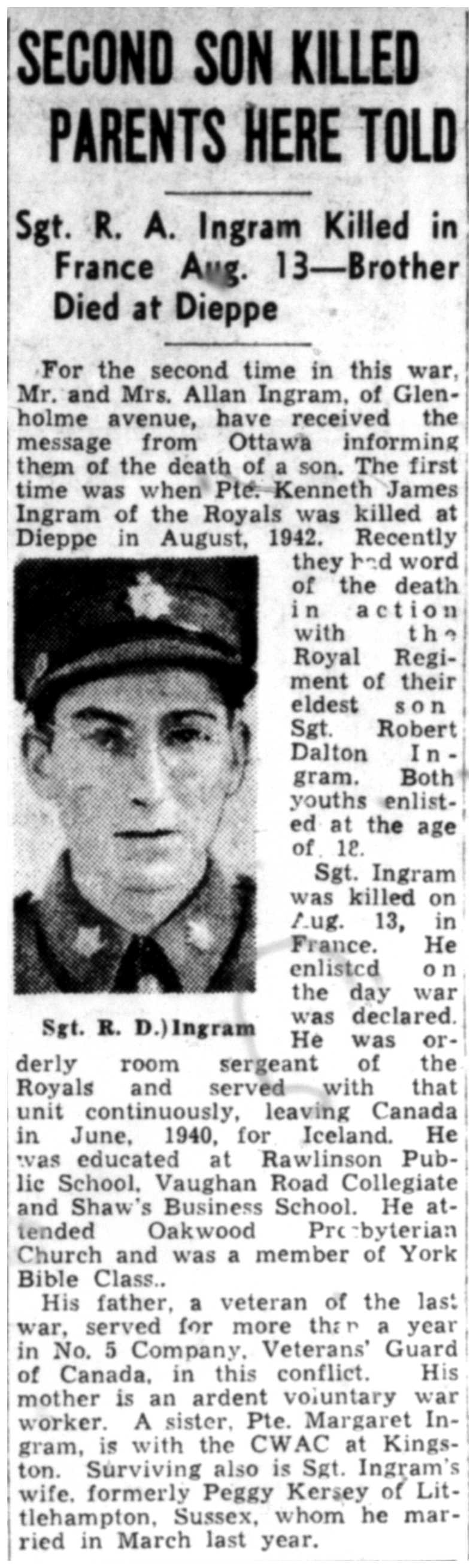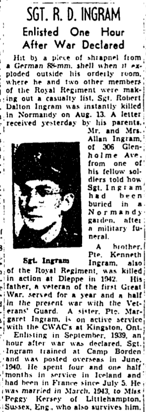 Fils de George Allan Ingram et Mary Alma Ingram, de Toronto, Ontario. Époux de Peggy E. Ingram. Son frère le soldat Kenneth James est décédé deux ans avant lui et ils partagent la même sépulture.