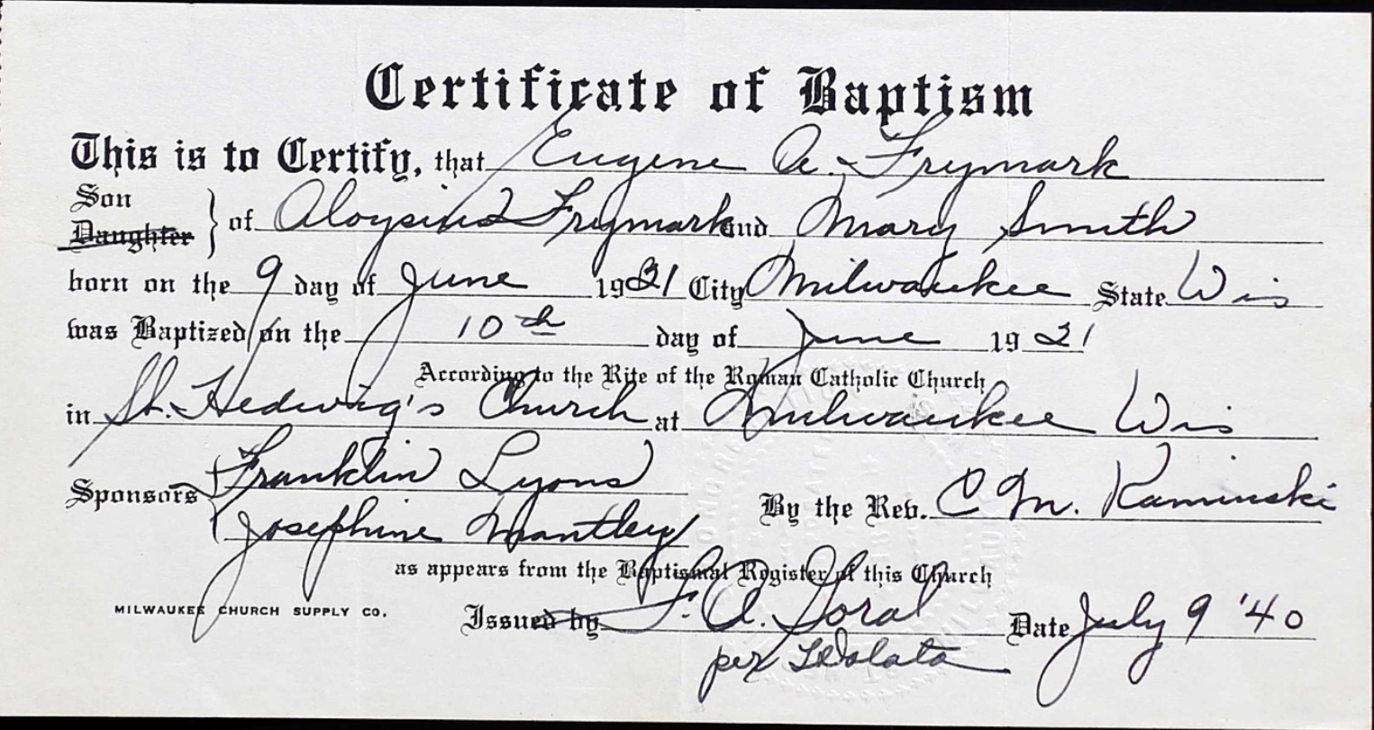 Fils de Aloysius Albert et Mary Julia Frymark, de Milwaukee.