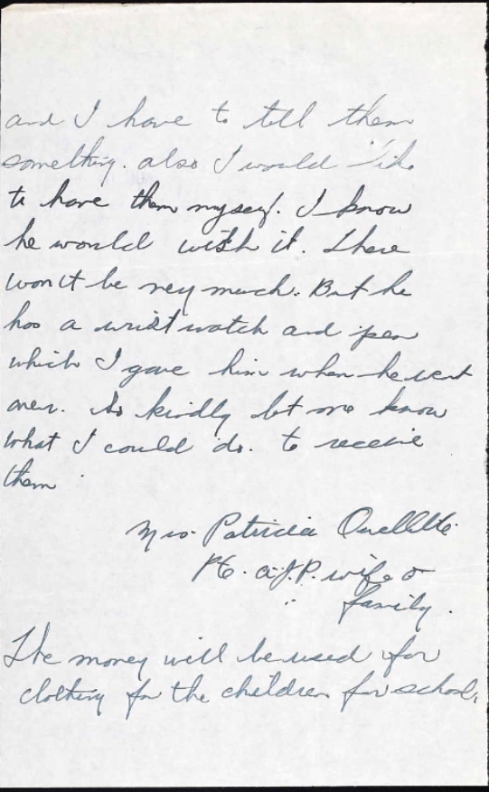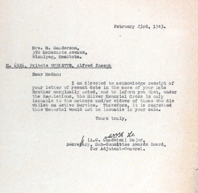 Demi-frère du soldat Frank W. Ouellette, matricule H-6500, qui a combattu en Europe, et beau-frère du soldat John Stephens, matricule H-6138, du 1er Bataillon du Winnipeg Grenadiers, prisonnier de guerre à Hong Kong et au Japon. Ils ont survécu à la guerre.