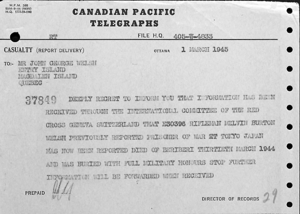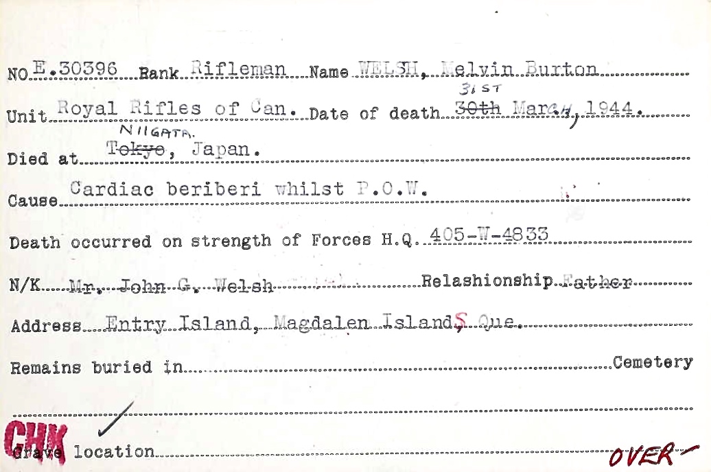 Ernest Edwin Welsh, E-30397, prisonnier de guerre à Hong Kong.