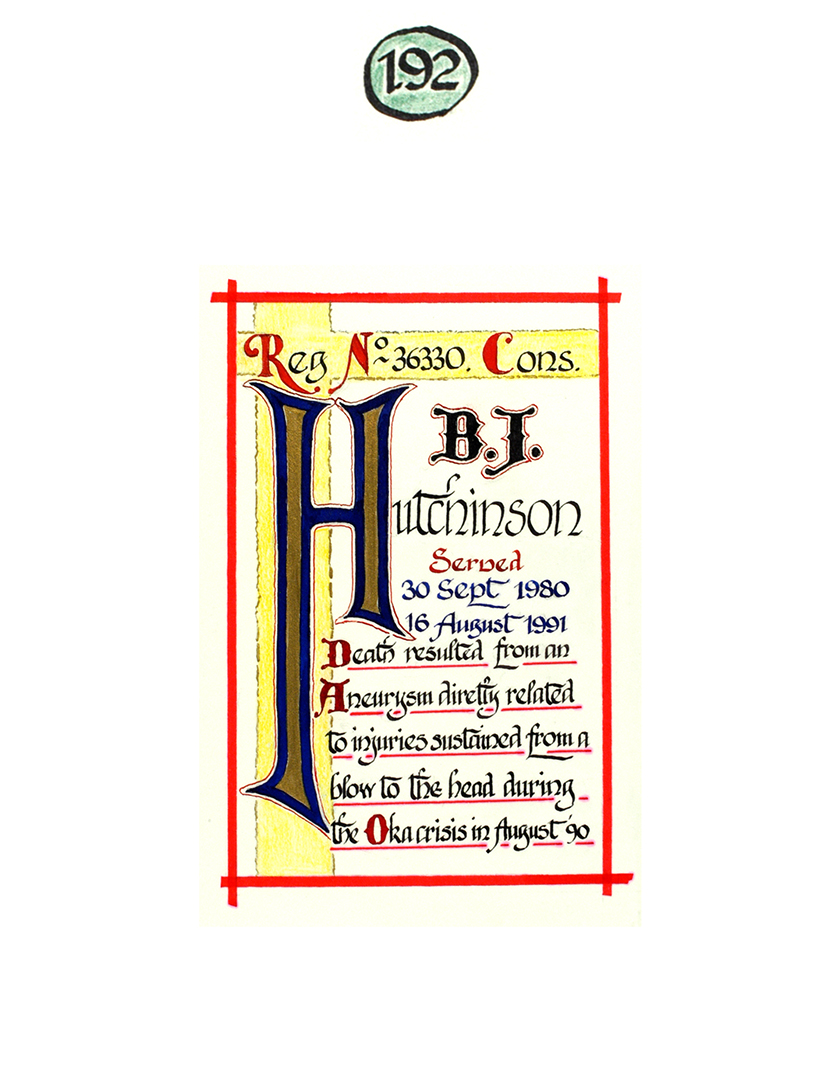 Le gend. Hutchinson était originaire de Nepean (Ontario). Il a été affecté à Craik (Saskatchewan), puis muté à Ottawa en 1985 pour raisons de famille. Le gend. Hutchinson aimait jouer au golf et passer beaucoup de temps avec sa famille. Il pratiquait le patinage, le ski de fond, la pêche, le ski nautique et la natation avec sa famille. Pendant la crise d’Oka, le Gend. Hutchinson a été affecté à la surveillance d’une barricade à Châteauguay. Des manifestants ont commencé à jeter des miniblocs et le gend. Hutchinson a reçu un coup sur la tête. Il est mort un an plus tard. Il était marié à Kim et ils avaient trois enfants prénommés Laurie, Stephanie et Stacie. Il est enterré dans le cimetière Capital Memorial à Ottawa.