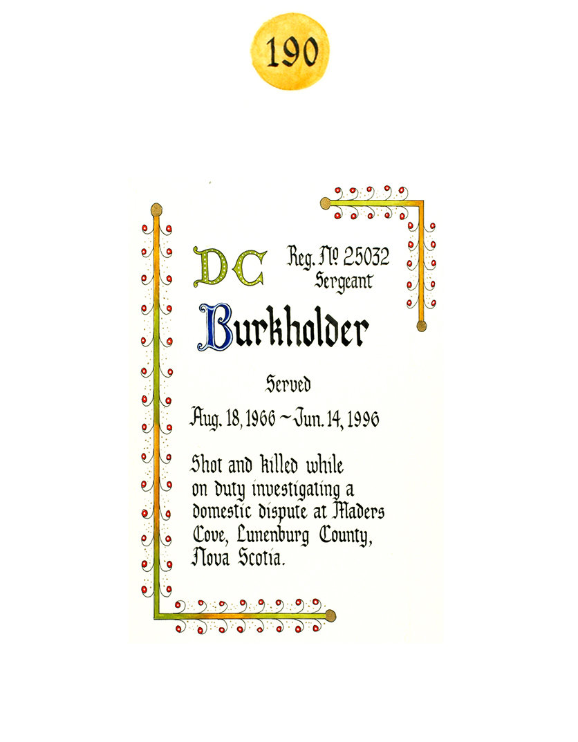 Le sergent Burkholder est né à Brampton, en Ontario, et a grandi au Nouveau-Brunswick. Il a travaillé dans plusieurs détachements en Nouvelle-Écosse. Le sergent Burkholder était connu comme un homme honnête et franc. Il était membre du Club Lions et bénévole au sein de l’organisme Grands Frères et Grandes Sœurs. Le sergent Burkholder aimait jouer au golf et au curling et passer le plus de temps possible avec sa famille.