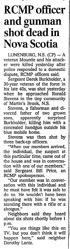 Il a laissé dans le deuil son épouse, Frances, et ses deux filles, Tammy et Tanya. Il s’agissait du premier meurtre d’un membre de la GRC en Nouvelle-Écosse. Le sergent Burkholder est inhumé au cimetière Brookside à Bridgewater, en Nouvelle-Écosse. Un tournoi de golf a lieu tous les ans pour honorer sa mémoire. Les profits du tournoi sont versés au Fonds commémoratif Sergent Derek C. Burkholder, qui a pour but de décerner des bourses à des finissants du secondaire.
