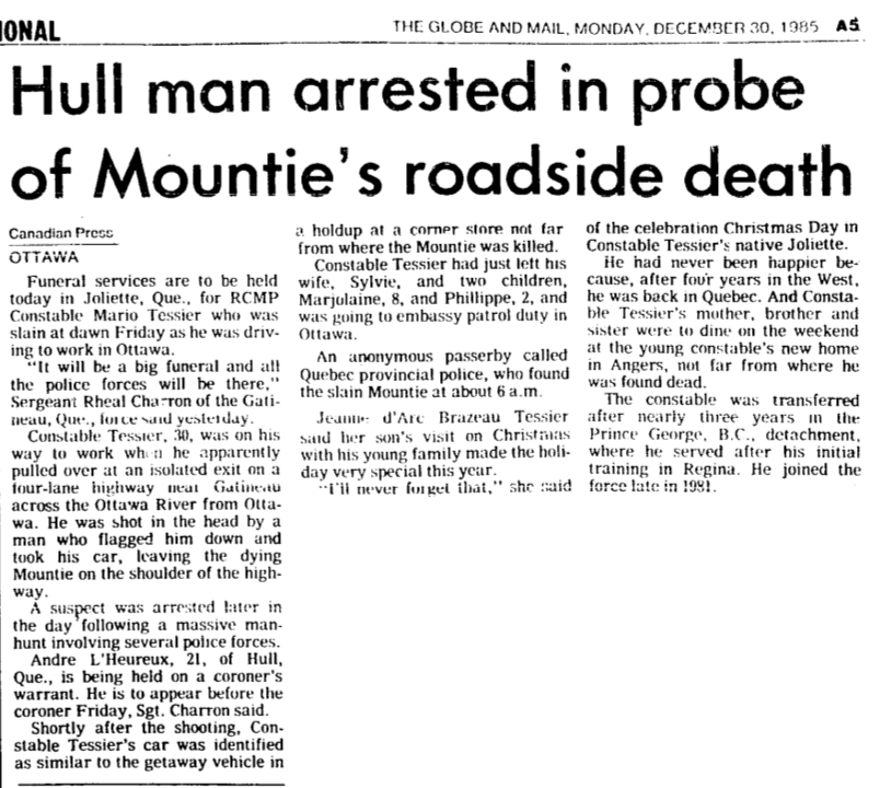 Le gend. Tessier est né à Joliette (Québec). Il a servi en Colombie-Britannique avant d’être muté à Ottawa. Le gendarme Tessier se rendait au travail lorsqu’il s'est arrêté pour aider un individu dont le véhicule était dans le fossé. L'homme est monté dans le véhicule du gendarme Tessier et il a tué le gendarme. Le gend. Tessier était marié à Sylvie et ils avaient un fils et une fille. Il est enterré dans le cimetière à proximité de l’église catholique, à Joliette (Québec).