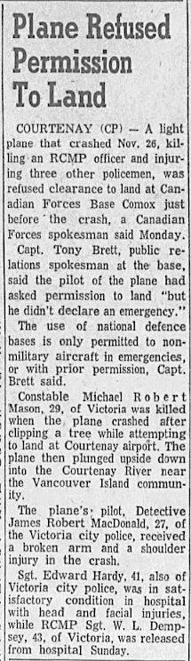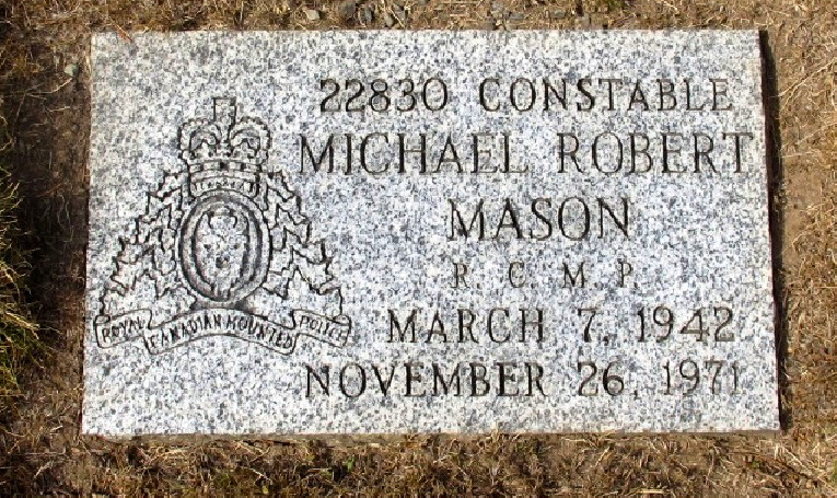 Le gend. Mason était un athlète fort et un joueur de hockey hors pair. Le pilote de l’avion à bord duquel il se trouvait tentait de faire un atterrissage d’urgence lorsque l’avion a percuté la cime des arbres bordant la piste. L’avion s’est écrasé dans la rivière Courtenay, assommant du même coup tous les passagers à bord. Le gend. Mason était marié à Carole et ils avaient deux enfants. Il est enterré dans le cimetière Royal Oak à Victoria (Colombie-Britannique).