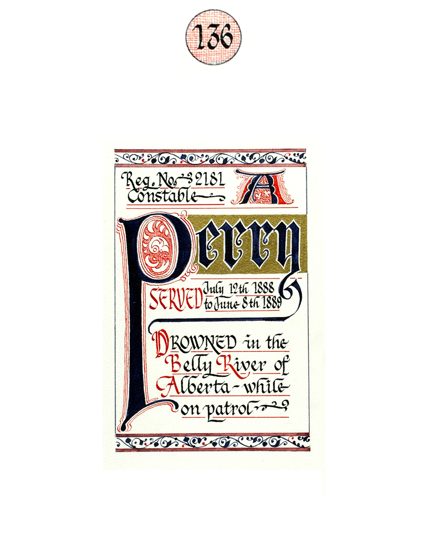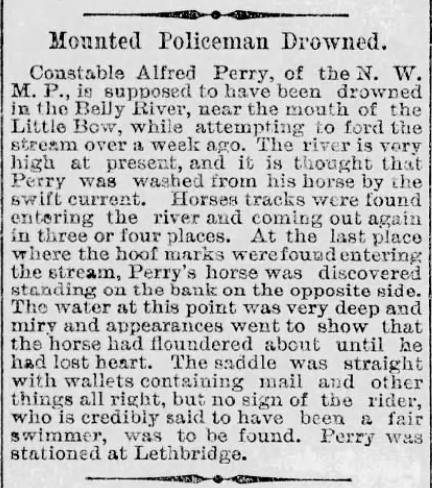 Le gend. Perry avait déjà travaillé comme manœuvre et servi dans la milice en Angleterre. Durant une patrouille, le gendarme Perry s'est noyé dans la rivière Belly, près de Lethbridge dans les Territoires du Nord-Ouest (aujourd'hui ce lieu fait partie de l'Alberta).