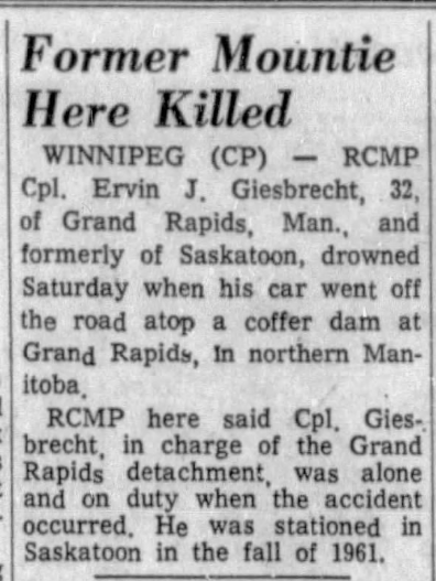 Le cap. Giesbrecht était un ex-poids lourd et champion de boxe « Golden Gloves ». Il a été promu caporal en 1962. Mort par noyade après avoir perdu la maîtrise de la voiture de police dans laquelle il prenait place et être tombé dans l’eau, au batardeau de Hybord (Manitoba). Il était marié à Elaine et ils avaient un fils. Le cap. Giesbrecht est enterré à Garry Memorial Park, à Fort Garry (Manitoba).