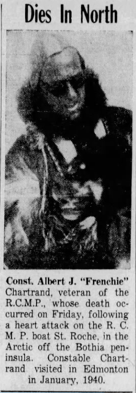 Avant de s’enrôler dans la Gendarmerie, il a travaillé à l’hôtel Grand Old Russell et a été camelot pour le journal Le Devoir. Le gend. Chartrand était amateur de plein air et il a patrouillé les établissements suivants dans l’ouest de l’Arctique : Aklavik, l’île Herschel, Coppermine et Cambridge Bay. Le gend. Chartrand consacrait aussi beaucoup de temps à l’élevage et au dressage de chiens de traîneau, et a même établi des records à titre de conducteur expert d’attelage de chiens. En 1940, le gend. Chartrand a été choisi pour faire partie de l’équipage de huit navigateurs sur la goélette St. Roch de la GRC, qui tenterait de traverser le passage du Nord-Ouest de l’ouest à l’est. Il est décédé d’une crise cardiaque à bord de la goélette St. Roch de la GRC, qui était prisonnière de la glace à la hauteur de Pasley Bay (Territoires du Nord Ouest). Le gend. Chartrand est enterré à Pasley Bay.