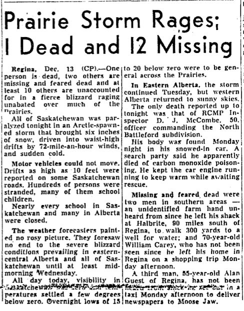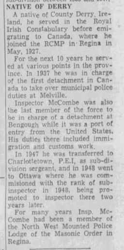 L’insp. McCombe était originaire de Belfast et a travaillé pour la Police royale irlandaise. Il est venu au Canada en 1925. L’insp. McCombe a effectué la majorité de son service en Saskatchewan, en plus d’être affecté à Charlottetown et à Ottawa. L’insp. McCombe a été breveté en 1950. Il est décédé de froid alors qu’il patrouillait près de Cutknife (Saskatchewan). Il était marié à Annie et avait trois fils. H. Barry McCombe, l’un de ses fils, s’est enrôlé dans la Gendarmerie et a pris sa retraite au grade de sergent d’état-major en 1994. L’insp. McCombe est enterré dans le cimetière de la Division Dépôt.
