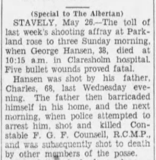 Le gend. Counsell était menuisier. Il est abattu à Parkland (Alberta) par un suspect recherché pour l’assassinat de son fils. Le gend. Counsell avait récemment épousé Audrey Blake. Il est enterré à Lethbridge.