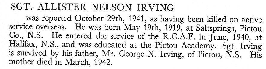 Fils de George U. Irving et Lola Mae Irving, de Pictou, Nouvelle-Écosse.
