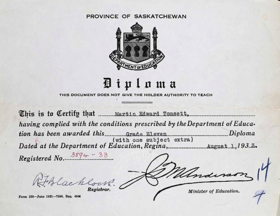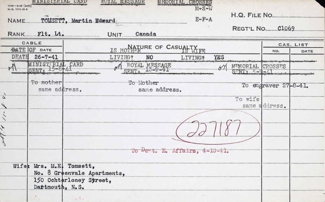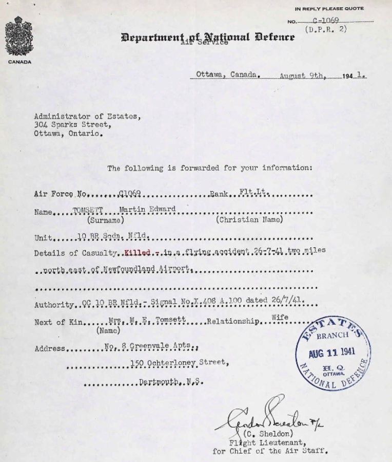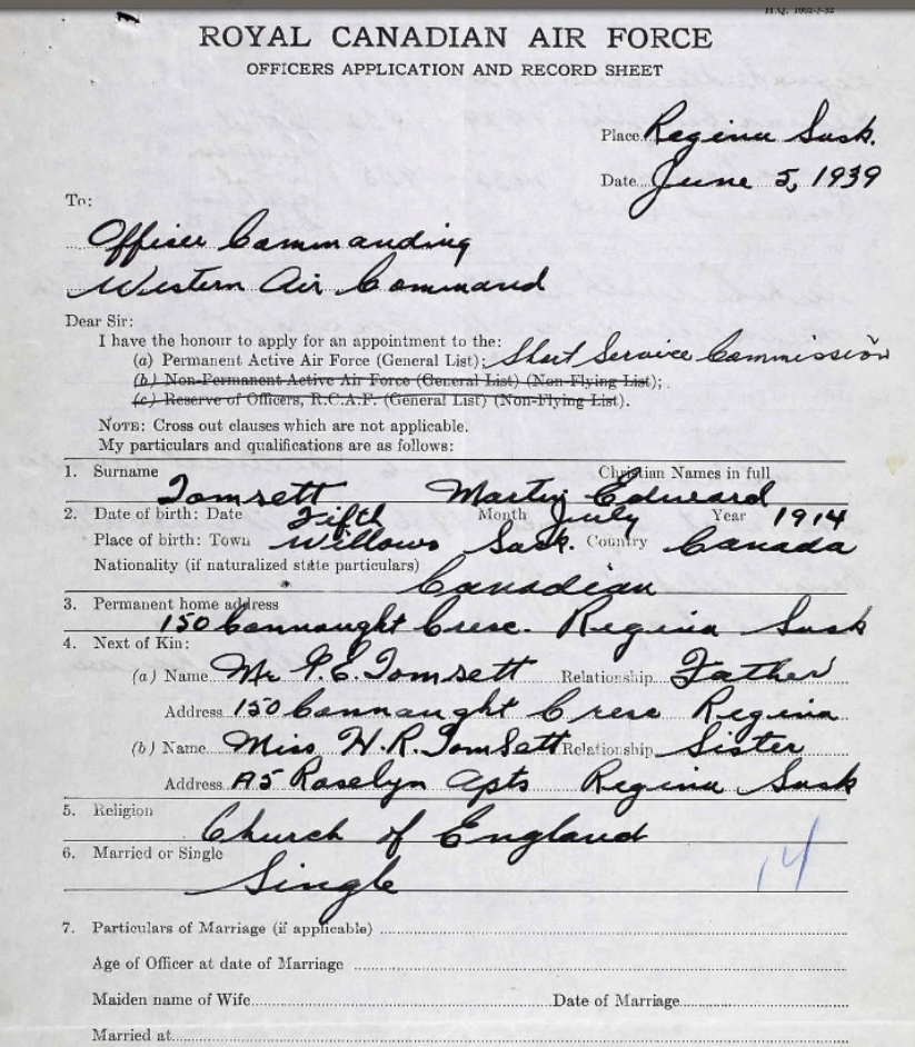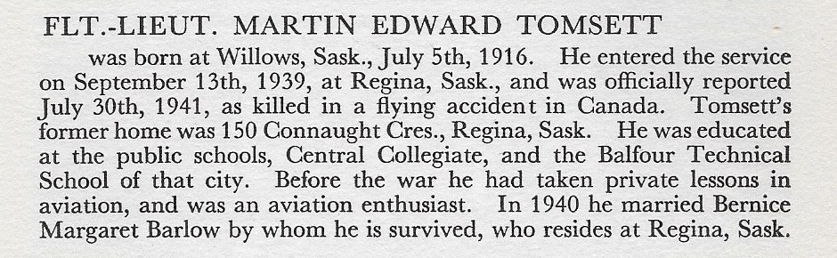 Fils de Gerald Elgar Tomsett et Mary Tomsett, de Regina, Saskatchewan; Époux de Bernice M. Tomsett, de Winnipeg, Manitoba.