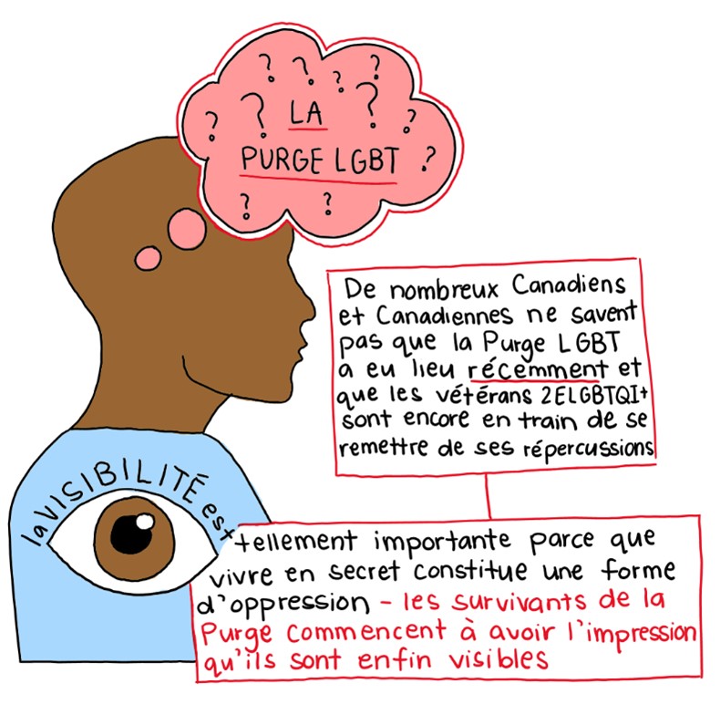 Au centre de l’image se trouve le profil d’une personne à partir des épaules, avec une bulle venant de sa tête surlignée en rouge. Elle contient beaucoup de points d’interrogation et se lit comme suit : « La Purge LGBT? ». Il y a deux zones de texte à côté du dessin, la première se lit comme suit : « De nombreux Canadiens et Canadiennes ne savent pas que la Purge a eu lieu récemment et que les vétérans 2ELGBTQI+ sont encore en train de se remettre de ses répercussions ». La deuxième zone de texte est connectée à la première avec une ligne rouge et se lit comme suit : « La visibilité est tellement importante parce que vivre en secret constitue une forme d’oppression – Les survivants et de la Purge commencent à avoir l’impression qu’ils sont enfin visibles ». Un grand œil est dessiné à côté de ce texte.