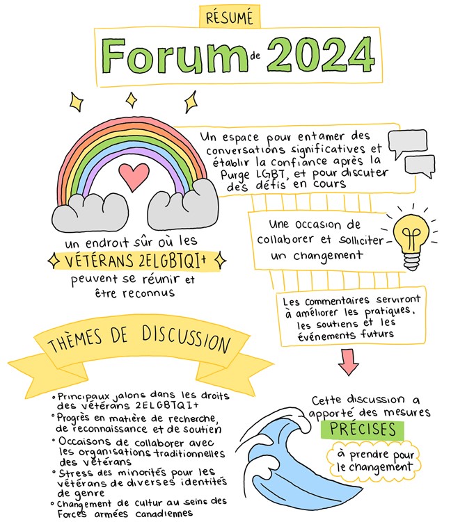 FIGURE 1: VISUALISATION GRAPHIQUE FOURNISSANT UN RÉSUMÉ DU FORUM DES VÉTÉRANS 2ELGBTQI+ 2024 D’ACC
