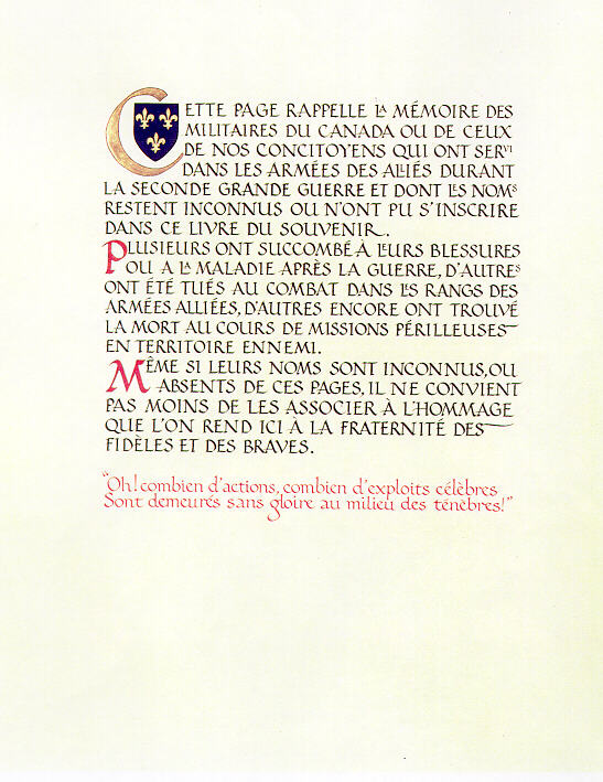Cette page est en vedette dans la Chapelle du Souvenir de la Tour de la paix, à Ottawa, les jours suivants :