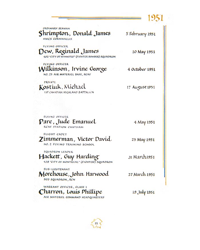 | 80002674 | Wilkinson | Irvine George | 4 octobre 1951 | Lieutenant d'aviation | No. 25 Air Materiel Base, RCAF |