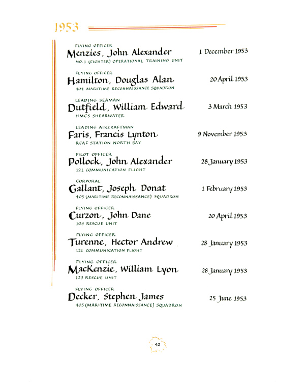 | 80002141 | Hamilton | Douglas Alan | 20 avril 1953 | Lieutenant d'aviation | 404 Maritime Reconnaissance Squadron |