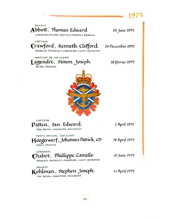 | 80001324 | Crawford | Kenneth Clifford | 20 décembre 1975 | Capitaine | Princess Patricia's Canadian Light Infantry |