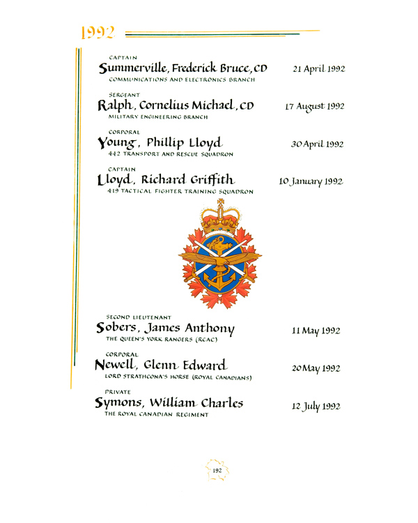 | 80002593 | Summerville | Frederick Bruce | 21 avril 1992 | Capitaine | Communications and Electronics Branch |