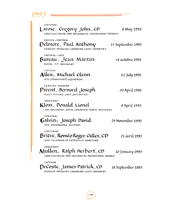 | 80001362 | DeCoste | James Patrick | 18 septembre 1993 | Capitaine | Princess Patricia's Canadian Light Infantry |