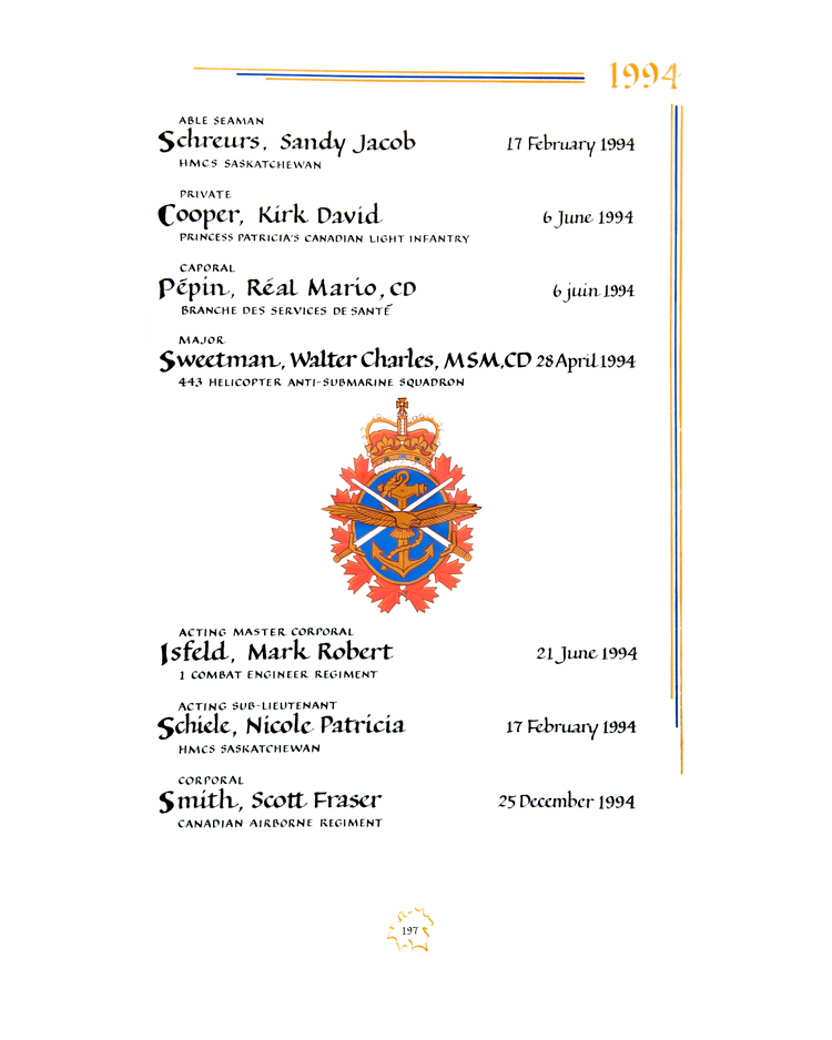 | 80002597 | Sweetman | Walter Charles | 28 avril 1994 | Major | 443<sup>e</sup> Escadron d'hélicoptères de guerre anti-sous-marine |