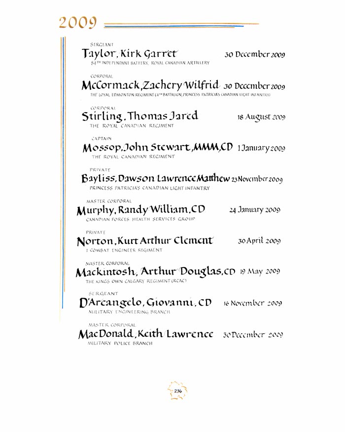 | 80003624 | Mossop | John Stewart | 1 janvier 2009 | Capitaine | The Royal Canadian Regiment |