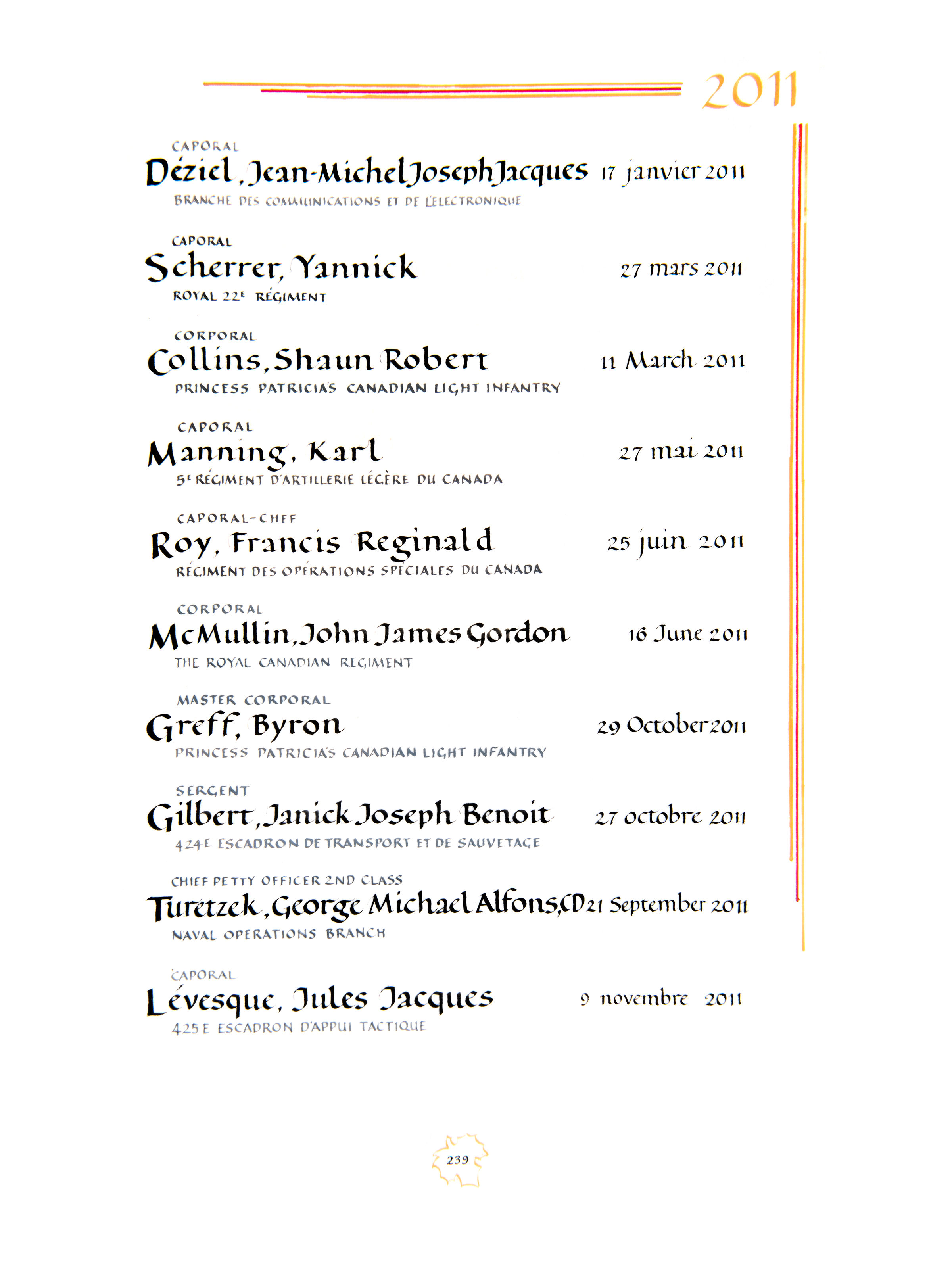 | 80003633 | Roy | Francis Reginald | 25 juin 2011 | Caporal-chef | Régiment des opérations spéciales du Canada |