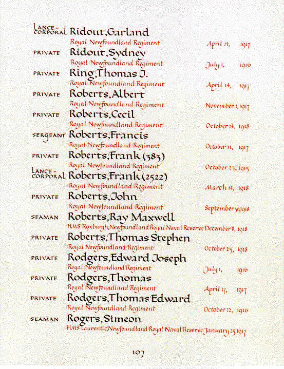| 206278 | Rodgers | Thomas Edward | 12 octobre 1916 | Soldat | Royal Newfoundland Regiment |
