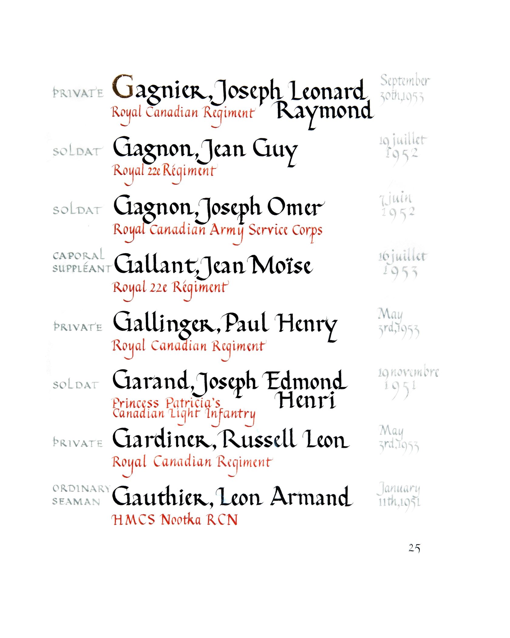 | 80000151 | Gallinger | Paul Henry | 3 mai 1953 | Soldat | Royal Canadian Regiment |
