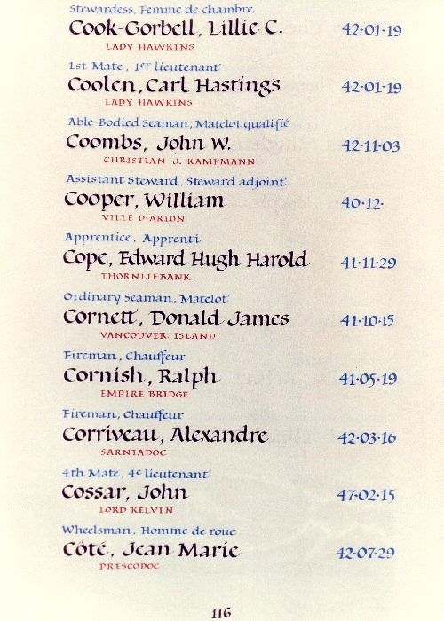 | 2557829 | Coolen | Carl Hastings | 19 janvier 1942 | 1st Mate | Lady Hawkins |