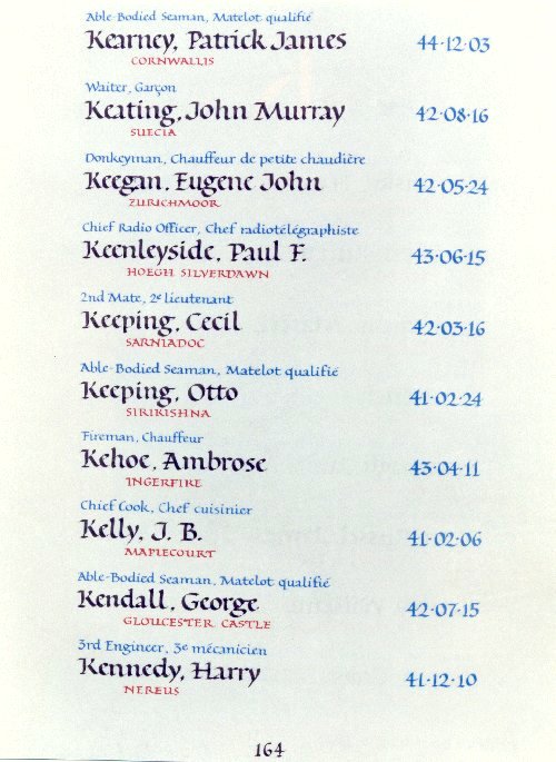 | 2558605 | Kendall | George | 15 juillet 1942 | Able-Bodied Seaman | Gloucester Castle |