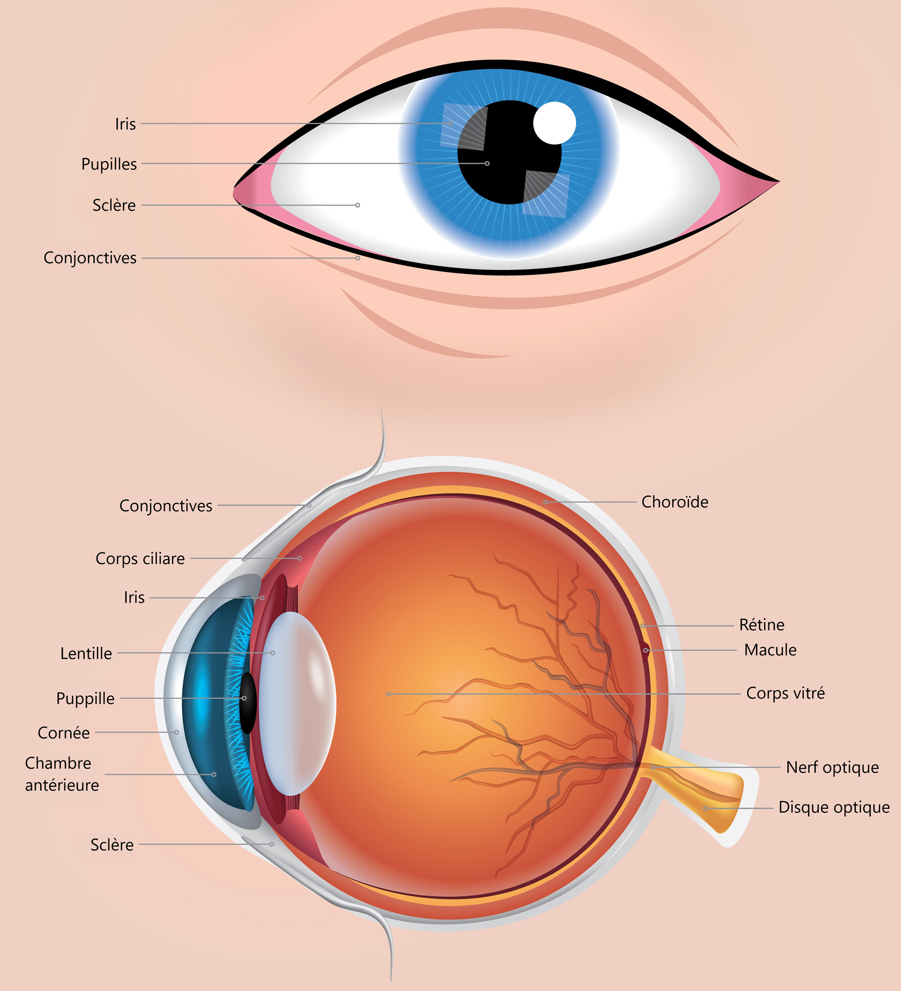 Image du haut : une vue avant de l’œil, mettant en avant l’iris, la pupille, la sclère et la conjonctive. Image du bas : une vue en coupe transversale montrant ces mêmes sections, ainsi que des structures internes supplémentaires. Les corps ciliaires, la lentille, la cornée et la chambre antérieure. L’arrière de l’œil comprend la choroïde, la rétine, la macula, le corps vitré, le nerf optique et le disque optique. Source : Anciens Combattants Canada (2024).