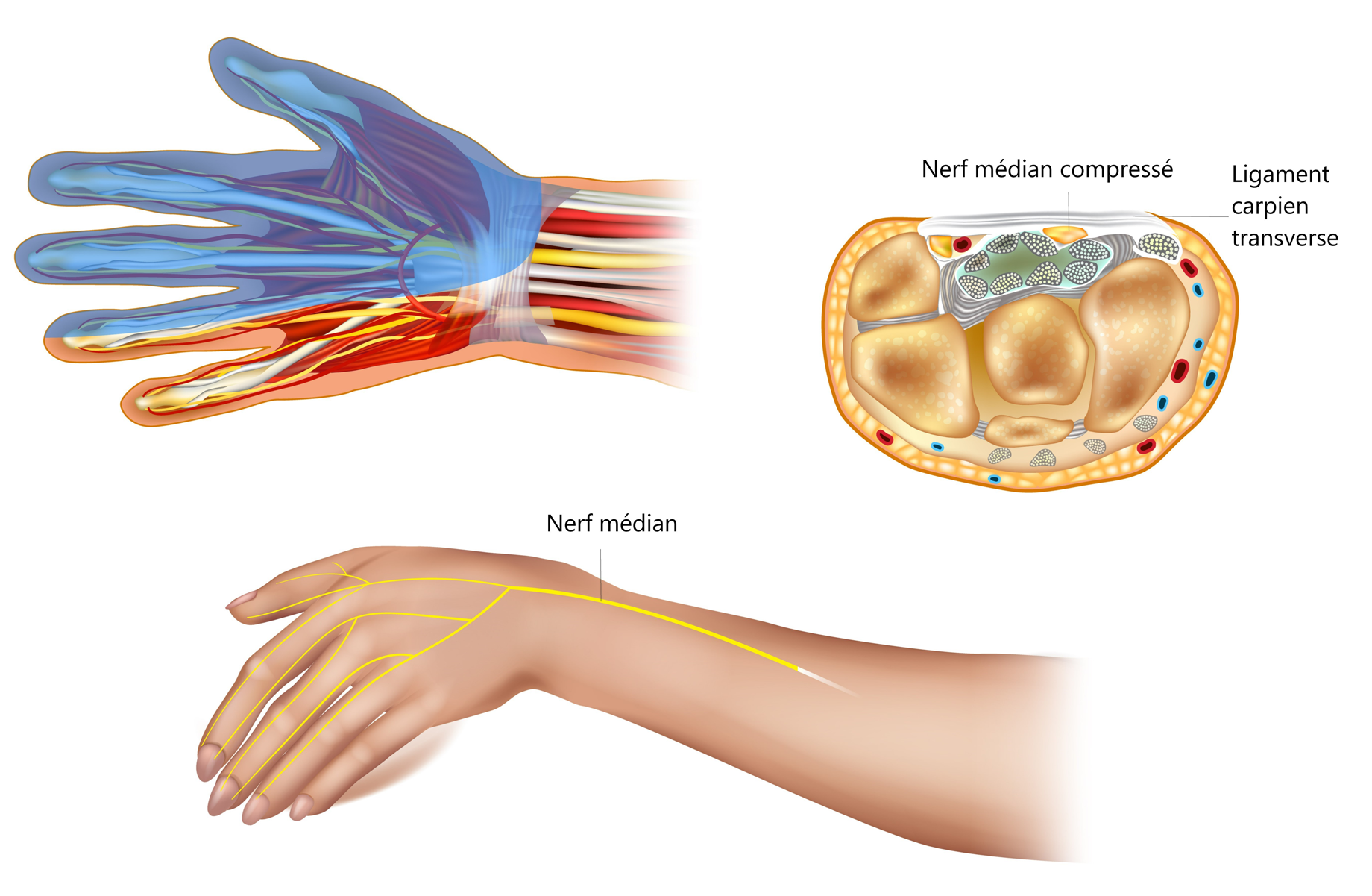 Le syndrome du canal carpien (SCC) est une neuropathie par compression du nerf médian. La compression du nerf médian dans le canal carpien du poignet altère la sensation et peut également affecter la force de la main.