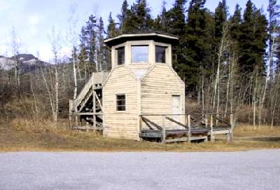 (plaque) Plus de 10 000 anciens combattants de la Première Guerre mondiale (1914 1918) se sont enrôlés pour servir au cours de la Seconde Guerre mondiale (1939 1945) et ont constitué en mai 1940 une unité spéciale de l'Armée appelée Garde territoriale des anciens combattants. Ne pouvant servir outre-mer en raison de leur âge, ces anciens combattants ont aidé à former les recrues en service actif ainsi qu'à protéger les installations militaires, les usines de guerre, les services publics essentiels et les chemins de fer contre le sabotage. Ils ont eu aussi comme rôle plus important à servir de gardiens auprès des prisonniers de guerre. Voici l'emplacement, au cours de la Seconde Guerre mondiale, du camp d'internement no 130 à Seebe, où étaient détenus à l'origine des objecteurs de conscience et des marins ennemis. Plus tard, on y a regroupé 650 prisonniers de guerre, dont la plupart étaient des officiers de l'Afrikakorps capturés par la British Eighth Army en Afrique du Nord. Dans un camp de tentes temporaire établi à neuf kilomètres au nord, dans la région de Morley Flats, on a détenu en 1942 10 000 prisonniers attendant leur transfert au camp de prisonniers de guerre no 133 nouvellement construit, à Lethbridge, en Alberta. Au cours de 1945 et de 1946, les prisonniers de guerre du camp Seebe gardés par les soldats de la Garde territoriale des anciens combattants ont abattu des arbres en vue de la construction du réservoir de Barrier Lake.