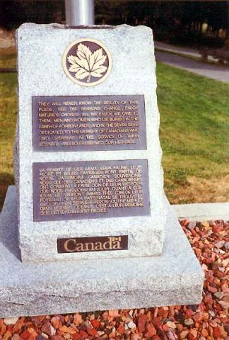LA BEAUTÉ DE CES LIEUX, LEUR FAUNE, LEUR FLORE ET LEUX PAYSAGES FONT PARTIE DE NOTRE PATRIMOINE CANADIEN. SOUVENONS-NOUS QUE DES CANADIENS ET DES CANADIENNES ONT CONSENTI À FAIRE DON DE LEUR VIE POUR QUE NOUS PUISSIONS EN JOUIR. QUANT À EUX, ILS NE LES VERRONT JAMAIS. TRÈS LOIN DE LEUR FOYER ET DE LEUR PAYS NATAL SE TROUVE LE LIEU DE LEUR DERNIER REPOS (OUTRE-MER ET DANS LES SEPT OCÉANS). C'EST À LEUR MÉMOIRE QUE CETTE STÉLE EST DÉDIÉE