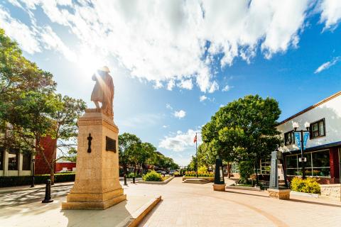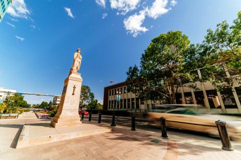 À la suggestion de Lochlan MacLean, il a été décidé que le monument serait une statue d’un soldat montée sur un piédestal. Le Soldat inconnu, la statue emblématique qui se dresse au sommet du cénotaphe de Red Deer, représente une statue de soldat faisant face à l’emplacement de la station du C.P.R. où de nombreux soldats sont partis pour le champ de bataille. La sculpture représente fidèlement la tenue d’un soldat canadien pendant la Première Guerre mondiale. Le soldat regarde vers l’ouest par-dessus son épaule, loin des ravages des champs de bataille européens, vers le bercail et la paix.