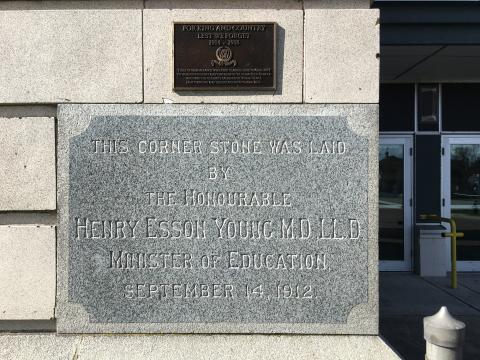 On April 20, 1917, some 2,500 citizens gathered as 14 silver maple saplings were planted along the Vining Street entrance roadway, now a walkway, to honour Victoria High School students killed in the Battle of Ypres. The Women’s Canadian Club donated the trees and organized the ceremony.