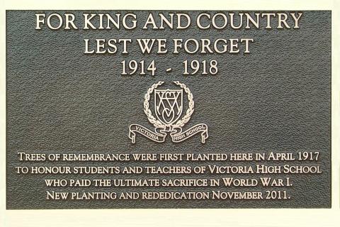 The dying trees were removed by the school district in 2011 and new trees were planted and rededicated on November 10, 2011. Red maple was chosen, in honour of both the original memorial trees and of the maple's symbolic significance to all Canadians. At the ceremony, the Victoria High Great War Banner was displayed hanging from the school facing Fernwood Road, as it was originally displayed in 1920.