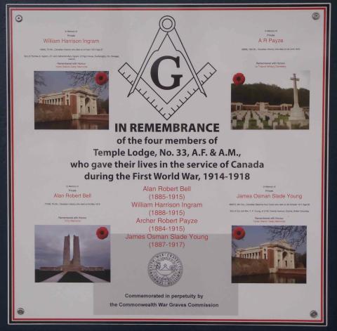 Elle fut alors remplacée par une nouvelle plaque commémorative à l’entrée du Temple maçonnique de Duncan, honorant ainsi la mémoire des quatre membres de la loge qui sont morts au service du Canada lors de la Première Guerre mondiale. Conçue par le frère Paul Philcox (lieutenant-colonel retraité), cette plaque fut inaugurée le 11 novembre 2013, par le vénérable maître Mark Anderson (de 2013 à 2015) et le maire de la ville de Duncan, Phil Kent, dans le cadre d’une cérémonie officielle publique.