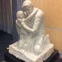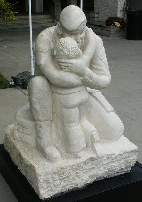 Bien que l’artiste Frances Brazeau soit aussi artiste-peintre et portraitiste, son matériau de prédilection est la pierre. La plupart de ses sculptures relèvent de la glyptique; l’art de graver les pierres en relief pour en dégager les images. Des éléments de pierre brute y sont alors souvent préservés. Il existe d’autres œuvres réalisées de façon à exploiter les textures et les tons naturels de la pierre, ou en permettre le moulage. Frances enseigne également la peinture, le dessin et la sculpture et a exposé ses œuvres dans plusieurs galeries du Canada. « Ma sculpture, Coming Home, est inspirée de plusieurs croquis que j’avais dessinés après que mon mari m’eût informée que les British Columbia Dragoons cherchaient une œuvre spéciale pour souligner leur centenaire. J’ai choisi le croquis qui conviait, selon moi, le mieux les émotions que vivent les membres des forces armées et leur famille : le retour à la maison des soldats, accueillis par leurs proches. Les Forces armées canadiennes jouèrent un grand rôle dans ma vie; mon père participa à la Première Guerre mondiale, mon mari était dans l’artillerie et l’un de mes petits-fils fait partie de la Réserve. J’ai toujours été très fière de nos Forces armées canadiennes. »