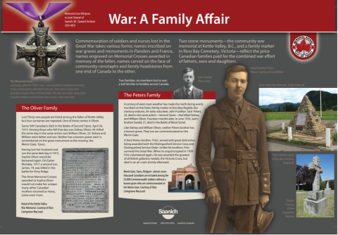 Ce panneau d’interprétation a été installé en 2019 par Saanich Parks le long de l’avenue Shelbourne Memorial, en mémoire des familles qui ont perdu des membres pendant la Première et la Seconde Guerres mondiales.