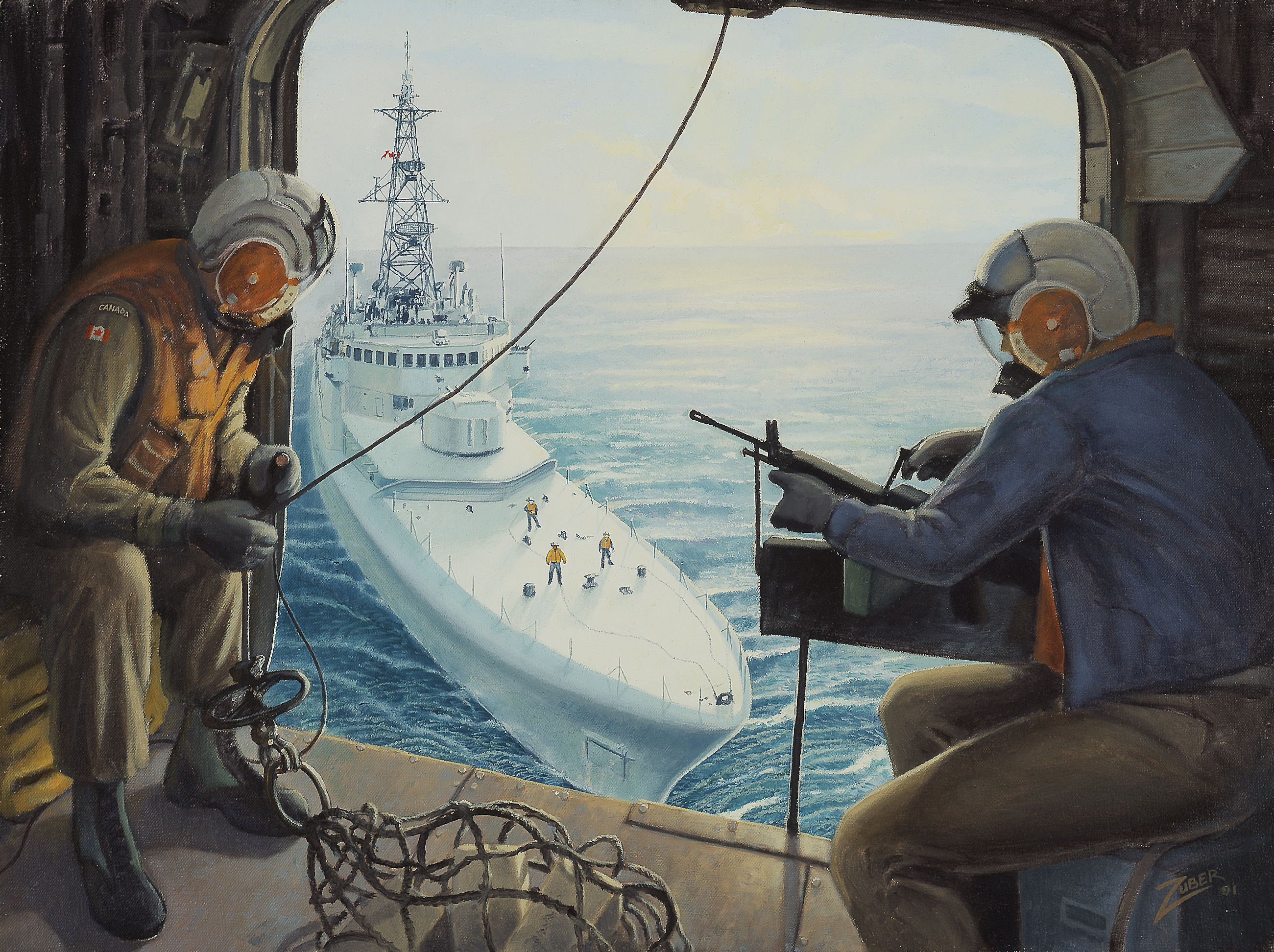 In this painting, two members of a helicopter's crew look out a door at the ship HMCS Terra Nova as it was sailing in the Persian Gulf. One member is holding a line connected to a net full of packages and letters from friends and family at home in Canada. Three sailors aboard the ship are standing ready to receive the packages. You can imagine they were excited to receive these treats and friendly messages from home!